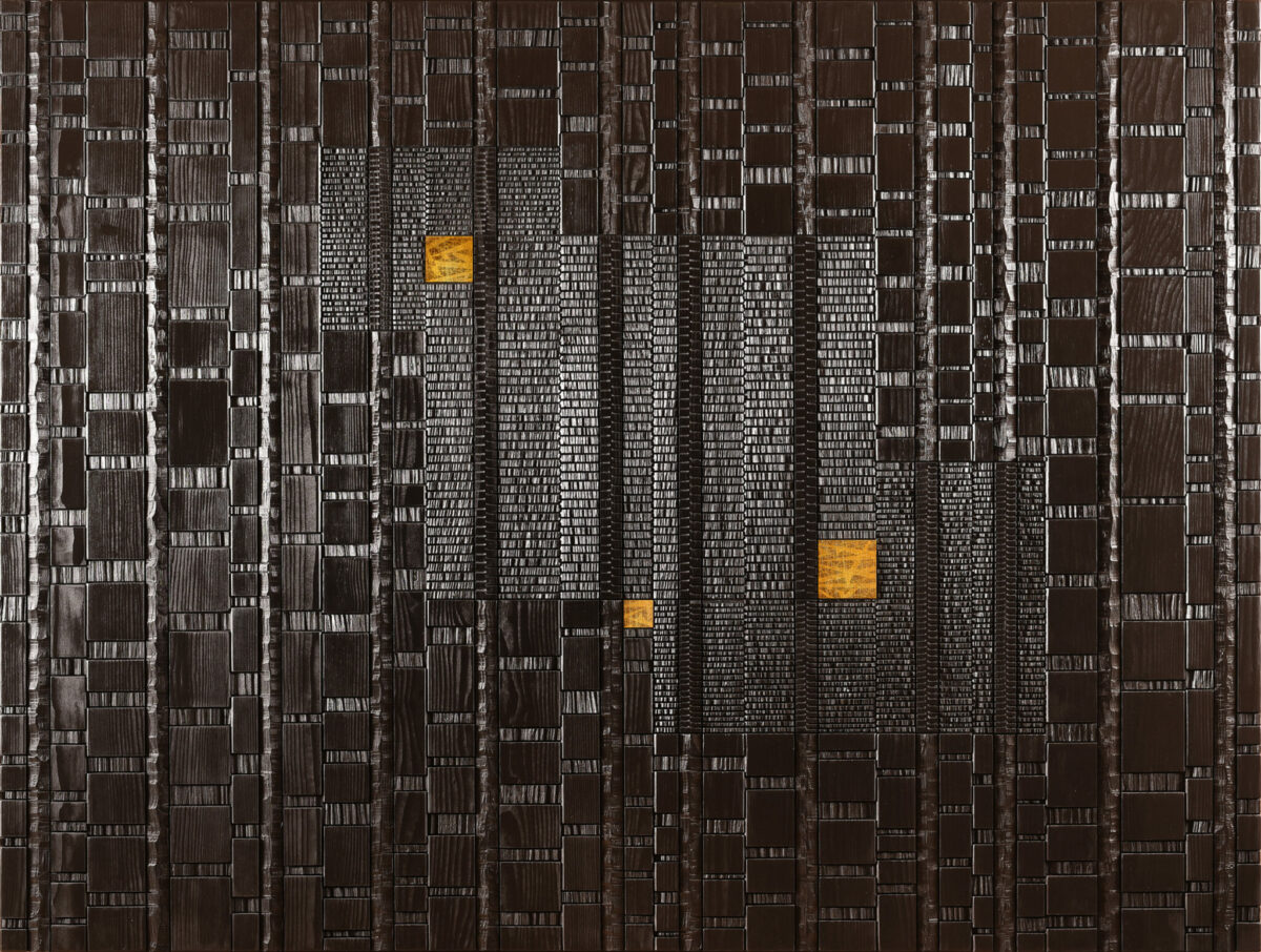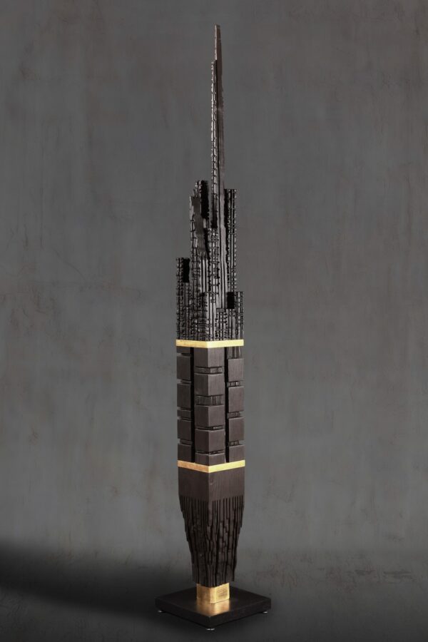 BUILDING II | Sculpture contemporaine en bois sur socle | Traitement : bois brûlé (yaki sugi ita ) puis application d'un fixateur naturel et plaquage à la feuille d’or | Dimensions : 154x37x25 | essence : sapin / mélèze